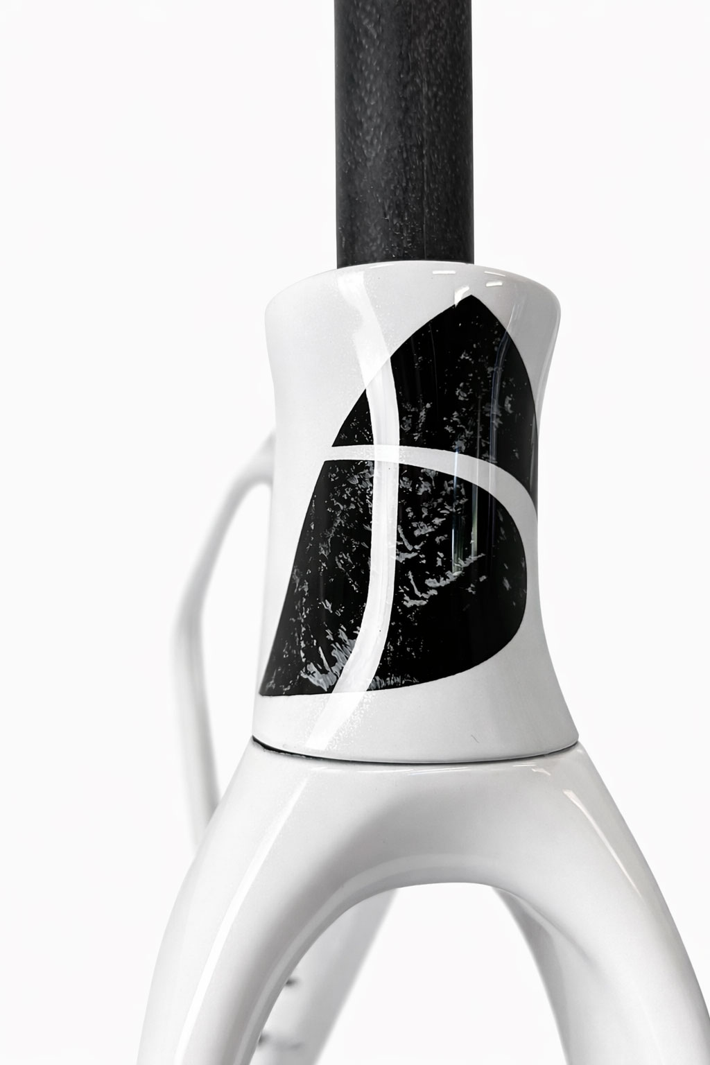 El contraste entre el blanco perla del conjunto y el efecto mármol en los gráficos crea un equilibrio muy atractivo, altamente sofisticado, diferente y plenamente integrado en el diseño general de la bicicleta.